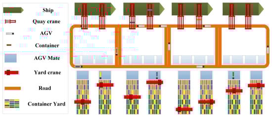 Figure 1 displays a representative process of container loading/unloading operations in an automated terminal that involves vertical and horizontal transportation by multiple equipment. By taking the import of containers as an example, quay cranes (QCs) are first assigned to berthing ships to unload the containers and transfer them to the AGVs, and the AGVs will transport the containers to a designated block of the container yard. When AGVs reach the designated block, AGV mates are used as a buffer to unload the containers from the AGVs and hold them until yard cranes (YCs) pick up the containers and transfer them to the corresponding location. The coordination of QCs and AGVs directly determines the efficiency of the loading and unloading operations on the sea side.