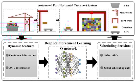 In order to address this issue, a handful of the literature has studied the dynamic AGV scheduling problems to be more adaptive in automated terminals. In the early days, various scheduling rules were used to dispatch AGVs in the dynamic scheduling problem [,], such as the first-come-first-serve (FCFS) rule, shortest travel distance (STD) rule, longest waiting time (LWT) rule, etc. Studies on dynamic scheduling problems indicated that using multiple dispatching rules could enhance the scheduling performance to a greater extent than using a single rule []. Angeloudis and Bell [] studied job assignments for AGVs in container terminals with various conditions of uncertainty. They developed a new AGV dispatching approach that is capable of operating within a certain container terminal model. Gawrilow et al. [] enhanced a static approach to meet the requirements of the dynamic problem. They developed a dynamic online routing algorithm that computes collision-free routes for AGVs by considering implicit time-expanded networks. Cai et al. [] investigated replanning strategies for container-transportation task allocation of autonomous Straddle Carriers (SC) at automated container terminals. By focusing on the uncertainty of the arrival of new jobs, this paper proposes two rescheduling policies, the newly arrived job Rescheduling (RNJ) policy and the newly unexecuted job rescheduling (RCJ) policy. The previous research on the dynamic scheduling of AGVs usually depends on specific assumptions of uncertain tasks or environmental factors, thus can only solve the problem within a given scenario. The related approaches are hard to generalize to other scenarios. Moreover, the complex environment of real terminals is hard to be defined by simple assumptions. Traditional optimization approaches cannot solve the dynamic scheduling of AGVs efficiently in real-world applications.