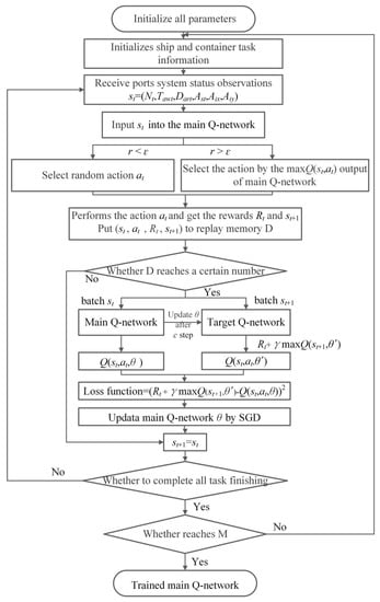 Based on the proposed model, we designed two fully connected neural networks, namely, the main Q-network and the target Q-network. Each network consists of one input layer, two hidden layers and one output layer, and each layer contains a given number of neuron nodes. According to the definition of states and actions, the first three nodes of the input layer represent the task information ,  and , and the remaining nodes correspond to the status information of each of the AGVs, including the working status  and the position coordinates . The number of nodes in the output layer is determined by a combination of the AGVs and the scheduling rules. Each node of the output layer represents a possible combination of the AGVs and the scheduling rules. The number of nodes in each of the hidden layers and the activation functions among the different layers are key parameters to be decided based on the input and output layers, which will impact the calculation accuracy of the neural network. There is no perfect theory to determine the number of hidden layer neurons or activation functions. The number of nodes in each hidden layer is decided by the simulations in our work, as in most of the literature. The ReLU function is used as the activation function between the input layer and the first hidden layer, as well as between the two hidden layers. The ReLU function is commonly used to increase the nonlinear relationship between the various layers of the neural network and to alleviate the occurrence of the overfitting problem []. The softmax function is adopted as the activation function between the second hidden layer and the output layer in our approach, which is also known as the normalized exponential function and is commonly used to show the results of multiple classifications in the form of a probability []. As shown in Figure 3, the major steps of the training algorithm can be described as follows: