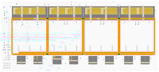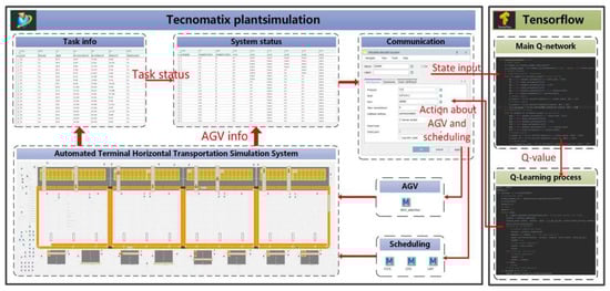 We used Siemens Tecnomatix Plant Simulation 15.0 to simulate the seaside horizontal transportation and vertical loading/unloading of the automated terminal. Through the built-in SimTalk language, a series of complex processes, such as unloading the container from the quayside crane to the AGV, transporting it from the AGV to the container yard and grabbing the container from the yard crane to the corresponding container position, can be simulated. As shown in Figure 5, we considered an automated terminal that consists of 4 berths, 8 QCs, 12 AGVs, 8 container yards and 8 YCs. There are four ships waiting to be unloaded in one training session, and each ship has 96 container tasks for a total of 384 container tasks.