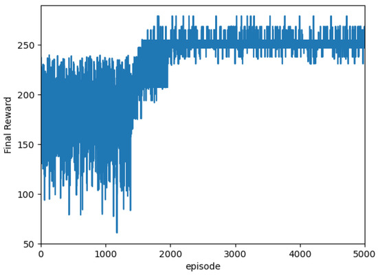 After inputting this state into the main Q-network, the action value function value Q-value is obtained, and the action is determined to be (2, 9) according to the selection policy; that is, the 9th AGV is used to perform STD and use transport container No. 004. When the action is completed, the reward function value  2.41, and the next state  (3, 191.0, 129.0, 3872.0, 66.0, 39.0, 53.0, 41.0, 15.0, 33.0...); therefore, the complete record of the scheduling process Re can be obtained,  ((5, 194.0, 258.68, 1920.0, 20.0, 34.0, 53.0, 41.0, 39.0, 13.0…), (2, 9), 2.41, (5, 194.0, 258.68, 1920.0, 20.0, 34.0, 53.0, 41.0, 39.0, 13.0…)), and then stored in the replay memory for the main Q-network to perform training. The training of DQN takes 5000 times to learn the optimal mixed rule policy for the dynamic scheduling of the AGVs. The training process is conducted on a server with an i7-6700 CPU @ 3.40 GHz and with 16 G RAM. The training result is shown in Figure 7: