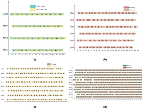 AGV scheduling Gantt chart. (a) 48 × 4, (b) 96 × 6, (c) 192 × 8, (d) 384 × 12.