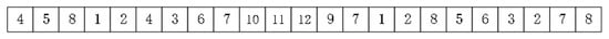 In order to integrate with the simulation case in 4.1, the implementation of the present-designed GA chromosome code in Python and the fitness values were calculated from the simulation program. We designed the GA chromosome in the form of real code; the chromosome length is equal to m (total number of container tasks), the position of the chromosome in the container task number and the gene value is the AGV number, which is the container for which the AGV performs. The chromosome form is shown in Figure 9, where the sequential gene values of 4,5,8,1,2,4 indicate that container tasks numbered 1 to 6 are performed by the AGVs numbered 4,5,8,1,2,4, respectively.
