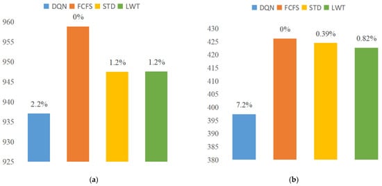 First, we considered a case with 384 container tasks and 12 AGVs with odd indices, in the above automated terminal simulation scenario, as an example. A total of 384 container tasks were randomly generated in the four different scenes and performed by 12 AGV sets. Twenty episodes for each scene were carried out, and the results of the average performance of all the methods are shown. The comparison between the total waiting time of the QCs and the total completion time of the AGVs is shown in Figure 10.