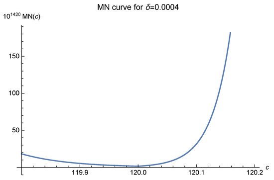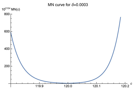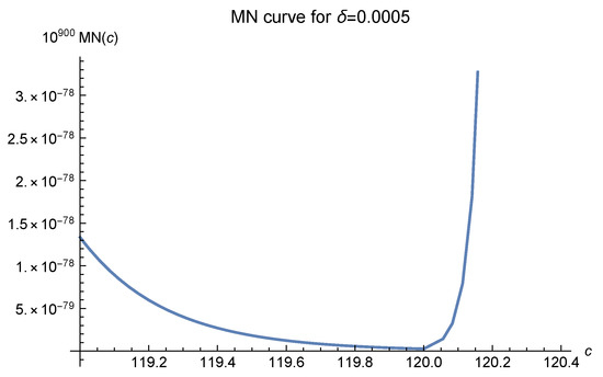 in the domain . Then, , and the MN curves of Case 2 for interpolation apply if we choose . The reason we adopt the inverse multiquadrics is that their programming is easier because the polynomial in (2) disappears. For , where exists, the way of dealing with interpolation for functions can be seen in Luh [2]. We offer six MN curves in Figure 1, Figure 2, Figure 3, Figure 4, Figure 5 and Figure 6, which serve as the essential error bounds for the function interpolations. The number , which greatly affects the MN curves, denotes the diameter of the interpolation domain. In these figures, it is easily seen that as the fill distance decreases, i.e., the number of data points increases, the optimal values of c move to 120 and are fixed there at last. The empirical results, as shown in Luh [12], show that one should choose to make the approximation.