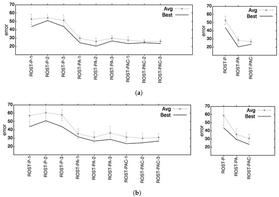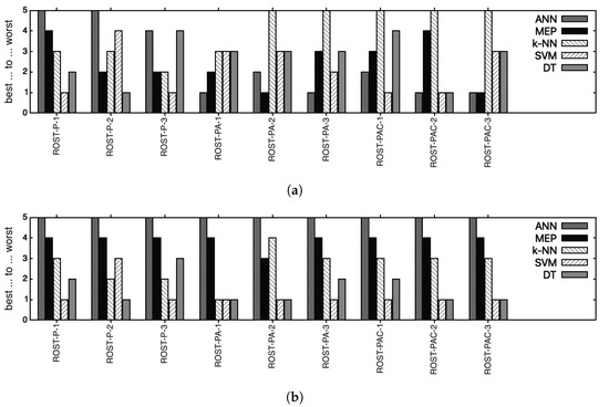 Using the cases option, we obtained improvements, as shown in Table A5. All error rates were improved, while the improvement in the tree size, although in some cases was significant (i.e., from 60 to 18, from 39 to 13, from 37 to 12, or from 38 to 14), in other cases the tree size increased or remained large (i.e., for ROST-P-3 from 64 to 99, for ROST-PA-2 from 38 to 58, and for ROST-PAC-1 it remained the same as when no option was used). For these three ROST-*-* mentioned above for which the tree size increased or remained large, the value of the cases parameter was very low (i.e., 1 or 2). For ROST-P-2 and ROST-PA-3, there is and the tree size did not change that much (i.e., from 38 to 31) and remained the same, respectively. For ROST-P-1, ROST-PA-1, ROST-PAC-2, and ROST-PA-3, , and the three decision trees have greatly reduced in size to values ≤ 18.