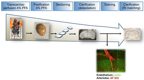 As described in the previous section, the cerebral tissue is opaque due to the presence of lipids, so conventional light microscopy is inefficient [,]. Hence, the lipids need firstly to be removed from this tissue for allowing the light passage without scattering or absorption, matching the refraction index (RI) between the tissue and medium. The tissue clarification is a chemical process of delipidation, decoloring and RI matching.