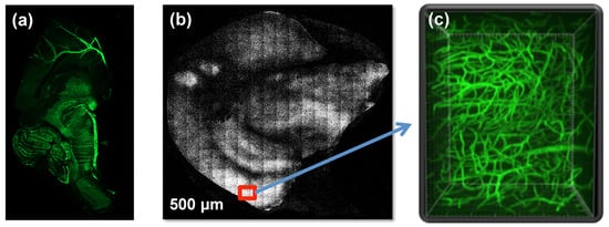 Image stacks (1 mm × 1 mm × 0.5 mm in size) were collected using a Zeiss LSM 880 (Carl Zeiss, Jena, Germany) equipped with a two-photon femtosecond pulsed laser (MaiTai DeepSee, Spectra-Physics, Milpitas, CA, USA), tuned to a central wavelength of 800 nm, using a 25×/1.8 objective (LD LCI Plan-Apochromat 25×/0.8, Carl Zeiss). Tiles of z-stack scan from m sections were acquired in the non-descanned mode after spectral separation and emission re-filtering using 500–550 nm and 645–685 nm BP filters for Lectin and Alexa 633 signals, respectively. In Figure 2, a lectin-stained vessels region is shown with a close-up view to a cubic sample.