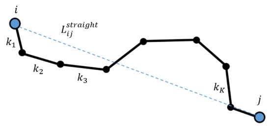The model handled in this study, after its processing, became a 3D network built from nodes and cylindrical segments in which all the constitutive equations were solved. This model was composed by a collection of interconnected nodes and segments of the BBB microvascular geometry. In this vascular network, the nodes represented locations where vessels bifurcated or ended, and the segments represented the vessels. Each node was defined by coordinates and each segment was defined by nodes and diameters. Every segment was then divided into several intermediate segments, making possible the use of tortuous vessel length instead of simplifying the vessels as straight lines between two end points (Figure 4). Hence, the total length of the vessel was obtained as the sum of the lengths of consecutive intermediate segments (Equation (5), Figure 4).