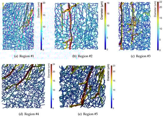 Morphology of the 5 cerebrovascular regions of the murine cortex considered in this study. The heat map represents by color the distribution of the value of the diameters within the microcirculatory synthetic network.