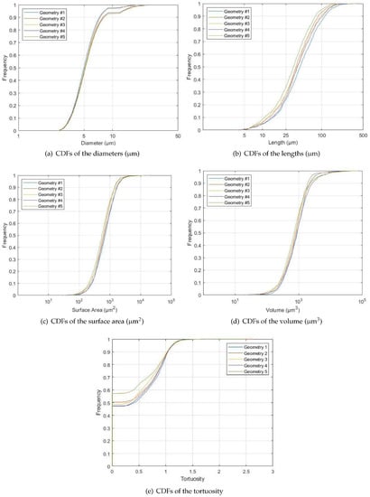 The network geometries are represented in Figure 5 and are colored by the values of the vessels diameter. These regions considered one inlet each but a different number of outlets, different vessel densities, mean diameters, curvatures and tortuosities and the number of bifurcations among other morphological differences. As visible from the figure, the morphology of the five regions is widely different. Of course, these topologies strongly influence the flow patterns and the associated nutrient transport in the surrounding tissue. For these reasons, it is relevant to show the different statistics associated to the flow simulations of the five cerebral regions. Frequency distributions of vessel diameters, length, surface area and volume that characterize the five networks reconstructed using the presented algorithm are shown in Figure 6. The geometries show a very good correlation in terms of segment diameters (in (m)) and lengths (in (m)), surface area (in (m)) and total vascular volume (in (m)) distributions, as shown in Figure 6 where the cumulative distribution function (CDF) of these variables is depicted. The presented curves match well the shape and order of magnitude of those presented by Linninger and coworkers [] which were obtained using a mathematical synthesis of the cortical circulation for a whole mouse brain. The obtained relations between the frequency of appearance and diameters, lengths, surfaces and volumes are in agreement also with those found by other authors, showing that the used geometries are suitable for further use in the numerical simulations of the microvascular blood flow. This comparison ensures that our image-based modeling presents anatomically consistent microvasculature.