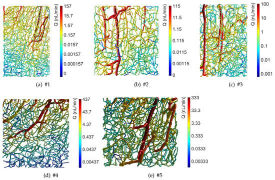 The blood flow distributions of the five regions is depicted in Figure 7 in logarithmic scale for enhancing differences within the vessel segments. As the regions are of different size and present important morphological differences, the maximum and minimum of the scale is different for each geometry. The results of the simulations showed that a peak blood flow of nL/min was found in Geometry , while the minimum blood flow was nL/min and belonged to Geometry . Summarizing, we found a mean blood flow of nL/min. This value differed from the values by Hurtung and coworkers []. However, even though they have found a maximum blood flow of around 780 nLmin, they considered wider regions and scales than the ones used in this work. Of course, the comparison can be only performed qualitatively because it is about different samples with variable morphologies. The important variability of the blood flows found in the present work can be explained by the geometrical differences presented by the 5 regions. In some of them, the feeding arteriolar branch present ’shortcuts’ to the outlets, having a preferential flow path of little resistance and increasing the blood flow. This happens, for example, in Geometries and , indicated in Figure 7. Furthermore, there are slight differences in the feeding arteriolar trunk diameters, varying from m in Geometry to m in Geometry , for instance. This causes less flow resistance for the same pressure loss between inflow and outflow, leading again to an increase of the blood flow.