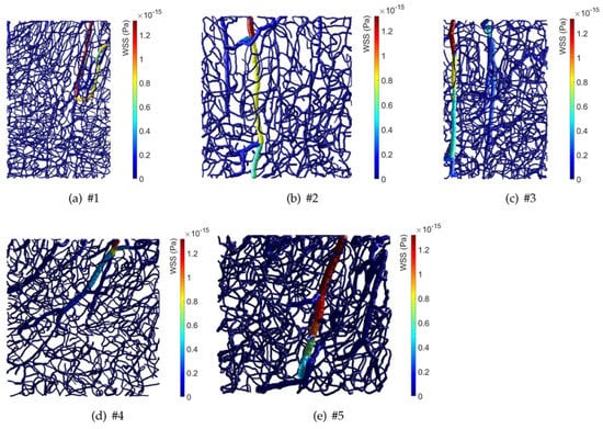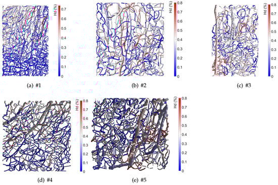 Figure 8 shows the hematocrit distribution within the five regions. Initially, a maximum hematocrit of has been set for any segment. The obtained distributions, as visible in the figure tend to be chaotic in all the regions. This happens because of the used geometries, as this distribution mostly depends on the asymmetry of the bifurcations inside the models due to the nature of the blood. As can be found in the literature, the hematocrit distribution differs from realistic to synthetic, symmetric, binary tree geometries. In these geometries, the hematocrit distribution is in fact mostly homogeneous []. The variations seen in Figure 8 are the result of the morphology of the five considered regions. The position of the venous drainage in the geometries can affect hugely the hematocrit distribution, as this is the location where the flow exits and where convergent bifurcations appear. Additionally, there are also some locations in the geometries where divergent bifurcations appear, leading to a decrease of the hematocrit in the segments until it reduces even to , as seen for instance in Geometry . On the other hand, in all geometries, some vessels with slightly high hematocrit values can be seen. These increases of hematocrit depends both on the segment diameter and on the feeding segment hematocrit, being usually convergent bifurcations.