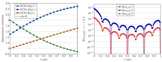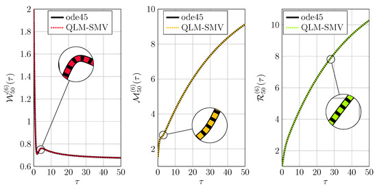 We next go beyond the unit interval and take a relatively large interval . The approximate solutions obtained by using the QLM-SMV and with bases are presented in Figure 6. Plotting further solutions obtained by ode45 show that our results are in good alignment with them. The related REFs are displayed in Figure 7. From the parameters given in the second test problem we find that the values of the basic reproduction number in (A4) and the second equilibrium point in (A3) become