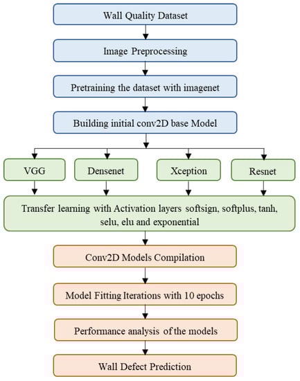 The workflow of the Conv2D ResNet exponential model is illustrated in Figure 3. An open access dataset (SDNET2018) published by Utah State University is used for implementation. In this proposed research work, the Snip&Sketch annotation tool was used for extracting the region of interest from the images available in the dataset. The Conv2D ResNet exponential model was trained with 4000 images and tested with 1000 images. The initial base model was pre-trained with initial weights using ImageNet, and Conv2D was designed with CNN models such as Xception, VGG19, DenseNet, and ResNet to extract the general high-level features. The base model was added to the custom layers, developed using a transfer-based DL approach, and the performance was analysed on wall quality prediction. The Xception, VGG19, DenseNet, and ResNet models were fitted with different activation layers, such as softplus, softsign, tanh, selu, elu, and exponential, and were evaluated using model loss, precision, accuracy, recall, and F-score measures.