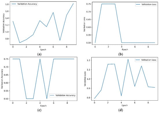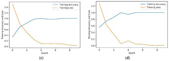 Model loss and accuracy of Conv2D models during training. (a) Xception; (b) VGG19; (c) DenseNet; (d) ResNet.