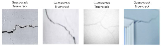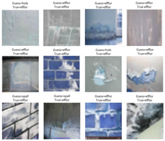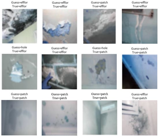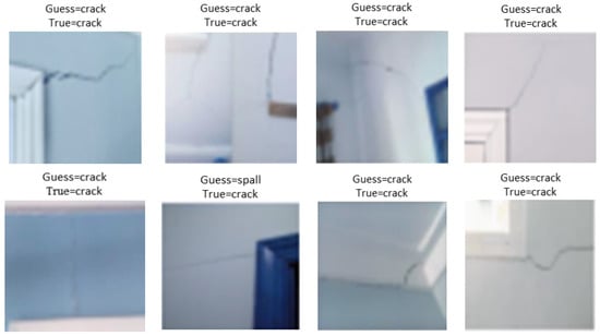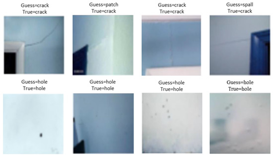 The wall quality dataset was fitted with the Conv2D ResNet model, which acted as a base model, thereby learning the types of wall defects from 90% of the training data. Now the model had learnt the exact region of interest through which it categorized the wall defect class as cracks, holes, efflorescence, damp patches, or spalls from the more significant number of images. The acquired knowledge from Conv2D ResNet was transferred to refit the model by integrating the layer with the exponential activation function, which identified the wall defects of a single image, thereby validating the transfer learning. When the test image was fitted with the Conv2D ResNet exponential model, the given image was validated with the wall defect class of the actual value and predicted value of the model, which was termed as the True and Guess label, respectively shown in Figure 8, Figure 9, Figure 10 and Figure 11.