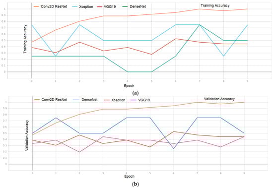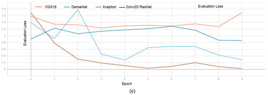 Implementation results portrayed that the proposed Conv2D ResNet model with exponential activation layer outperforms with an accuracy of 0.9147, precision of 0.9212, recall of 0.9134, and F-Score of 0.9978 compared with other Conv2D models, such as Xception, VGG19, and DenseNet. The comparative study of learning accuracy during the training and validation phases of the implemented models is represented in Figure 12a,b. The results illustrated the accuracy of each model at every epoch, and it is noticeable that the proposed Conv2D ResNet exponential model steadily gained accuracy at every epoch, whereas the VGG19 model struggled for accuracy during both phases. The DenseNet and Xception models showed instabilities with epochs. The evaluation loss attained by the models is depicted in Figure 12c, which shows that the Conv2D ResNet exponential model had minimal losses at each epoch compared with the DenseNet, Xception and VGG19 models in that order. The Conv2D ResNet exponential model performed efficiently, producing a greater accuracy with minimal loss in wall quality detection.