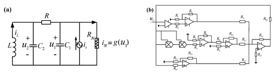 Here, we consider one modified Chua’s circuit by introducing a current source, as shown in Figure 1a. Such a circuit system consists of two capacitances , one inductance L, one constant resistance R, one sinusoidal current source and one nonlinear resistance . According to the Kirchhoff Law, the state equations can be expressed in the 3D ordinary differential equations
