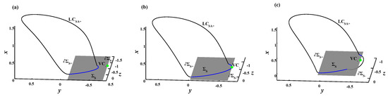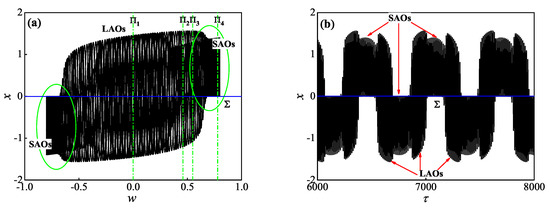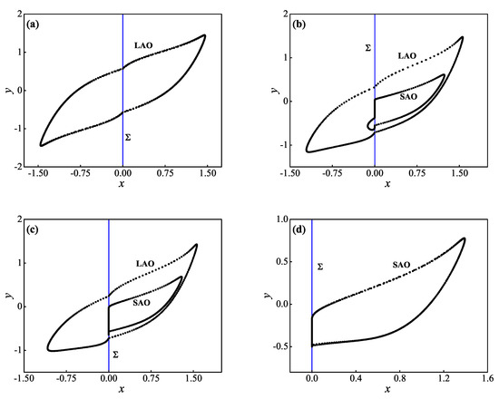 According to the Poincaré maps in Figure 4, it is not difficult to predict that limit cycles, i.e., the so-called spike attractors exist in the Filippov fast subsystem (4). Furthermore, the relatively large closed curves intercepted from LAOs, labeled as LAO in Figure 4a–c, indicate that the corresponding spiking attractor behaves in crossing motions on . While the relatively small closed curves intercepted from SAOs, labeled as SAO in Figure 4b–d, indicate that the corresponding spiking attractor behaves in sliding motions on .