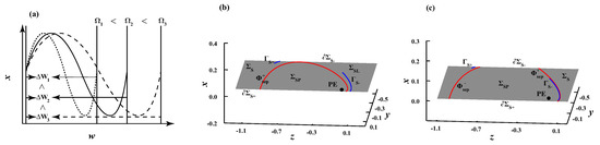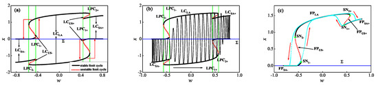 Considering the symmetry, as shown by the green circles in Figure 3a, two spike attractors corresponding to the two SAOs exist in (4), respectively, labeled as () and (). Taking as the example, Figure 5 gives the corresponding geometry of sliding bifurcation, where crosses through the visible cusp point on when to undergo a multi-sliding bifurcation, seen in Figure 5b, leading to the single sliding segment in Figure 5a turns into two sliding segments in Figure 5c.