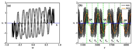 When , seen in Figure 11b, the whole system response is a symmetrical period– TBOs. Similarly, with the whole system response with , the trajectory in this case also passes through the rest spike bistability II and III once when it oscillates along with spike attractor , respectively. However, we can find that the transition induced by the DSV effect may take effect at the two transition locations, leading to the trajectory transition from to . That implies the appearance of the symmetrical period– TBOs consisting of two QSs characterized by sticking motions and two SPs characterized by spiking oscillations without LAO.