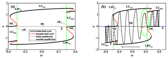 Since the discontinuity boundary is defined by , we redraw the phase portrait in plane and the time history of x of the MTSOs when , respectively, given in Figure 3a,b. Then we may find that every spiking oscillation contacts the discontinuity boundary (denoted as the blue horizontal line). Meanwhile, Figure 3a also reflects that the mixed tonic spiking oscillation with may be not strictly periodic.