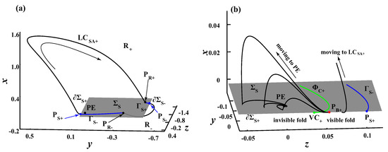One may note that all the sliding trajectories between and inescapably cross through the visible fold points between and . Thus, the attractor basin structure can be easily obtained by which of the rest spike bistabilities II the trajectories from these visible fold points eventually converge to. Via numerical verification, the point divides the sliding boundary between and into two segments. As shown in Figure 9b,where trajectories starting from visible points between and converge to to behave in sticking motions after a minimal oscillation in , while trajectories starting from visible points between and oscillate to spike attractor . Similarly, another special sliding orbit, denoted as , can be obtained numerically by taking as the initial condition of (18). It can be regarded as an attractor basin boundary of the rest spike bistability II in sliding region.
