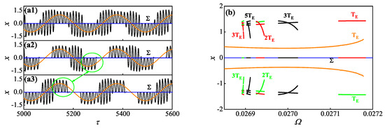 When , tristability structure can also be observed in the whole system. As shown in Figure 13a, one symmetrical period– TBOs, which has been presented in Figure 11b, can coexist with two asymmetrical period– MTSOs, the corresponding initial conditions from top to bottom are , and , respectively. Similarly, we also give the Poincaré map when in Figure 13b, where the symmetrical period– TBOs (colored in orange) can persistently exist in the whole frequency range. Meanwhile, both the two asymmetrical period– MTSOs presented in Figure 13(a2,a3) perform the obvious period-doubling cascades along with the decrease of , colored in light gray and gray, respectively.