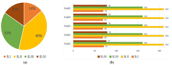 Digital Database for Screening Mammography (DDSM) [11]. The DDSM database consists of 2620 mammography screening cases containing a total of 10,480 mammograms with a resolution of 4000 × 6000 pixels. Moreover, they are stored in portable gray map (PGM) format with 16 bits; every case includes two views of bilateral breasts craniocaudal (CC), mediolateral oblique (MLO), breast laterality (right vs. left), and Breast Imaging Reporting and Data System (BI-RADS) breast density (four categories: almost entirely fatty, scattered area of fibroglandular density, heterogeneously dense, and extremely dense). We selected two views of each breast density category, totaling 5406 images, and the image distribution over the four categories presented in Figure 4a. Five-fold cross-validation is used to train and test models. Figure 4b shows the data distribution for each fold.