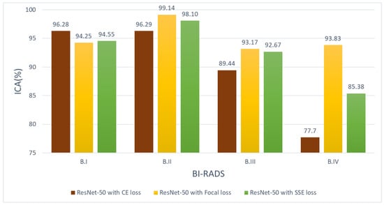 As mentioned in Section 3.5.1, We considered three loss functions: cross-entropy, focal, and SSE. We used the pretrained ResNet50 model as the backbone CNN model to test the effect of these loss functions. Figure 6 and Figure 7 show the results of the three-loss function on the DDSM dataset. The focal loss function yields the best results in terms of all performance metrics because focal loss does this by decreasing the weight given to simple examples in the loss function, hence focusing on more hard examples. Table 6 shows the results. In Table 7, we provide the confusion matrix produced from the best experiment result to explore the classification behavior of the model.