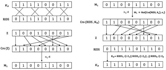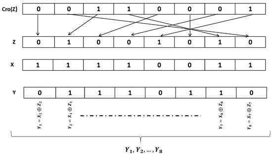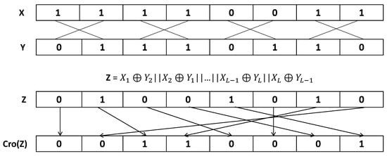 - Self-combination crossover rearrangement procedure: At this stage, the bits resulting from XOR of X and Y based on the relations explained above, represented by Z, are rearranged according to the following pattern and form the final output of the operation, which is . Given X and Y are 8-bit strings, is computed as ,,,,,, and . Figure 1 illustrates a recap of these procedures.