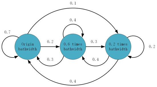 Due to the limited number of edge computing nodes, it may not be enough to meet the needs of computing all tasks at the same time in one computation offloading cycle. We define the channel bandwidth between the device n and the edge computing node f as . Since the available bandwidth resources between device and edge computing node is time-varying, we assume that the bandwidth variation conforms to a Markov process. There are three states of original bandwidth, 0.6 times bandwidth and 0.2 times bandwidth. The transition probability between each state is shown in Figure 2.