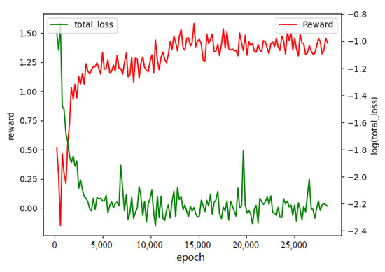It can be seen from Figure 4 that the network loss value has been declining and finally approaches zero near the th generation. The reward function has a significant improvement in this process and tends to be stable around in the th generation. This shows that the agent is increasingly accurate in estimating the environment Q-value in the continuous interaction of the environment and has learned the method to improve the target reward value.