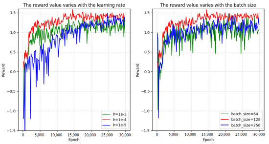 It can be seen that, when a higher learning rate is selected, the learning effect is not good, and the reward function cannot converge due to oscillation back and forth. When a lower learning rate is selected, the reward value function converges slowly and cannot reach the optimal value. Similarly, when a large batch size is selected, convergence of the reward value function is difficult, and it is difficult to reach the optimal value. When a small batch size is selected, it is difficult for the agent to effectively learn knowledge, resulting in non-convergence of the training curve.