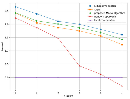 In order to demonstrate that our proposed MACA algorithm is superior to traditional methods, we compare the performance of the MACA algorithm with a deep Q-learning algorithm, random offloading approach, and local computation approach. To ensure fairness in comparison, we use the same training trick of double Q-network and dueling Q-network in DQN. It can be seen that the reinforcement learning algorithm is more effective than the random approach and local computation approach. Moreover, when the number of devices as independent agents increases, the performance of DQN decreases significantly, while the performance of our proposed algorithm remains relatively stable. This is obvious because, as the number of agents increases, the action space of the DQN algorithm will increase in geometric multiples, while the multi-agent algorithm will combine the rewards of each agent into an overall reward, which only increases the action space linearly, thus allowing it to easily avoid this problem, and the specific results are shown in Figure 8.