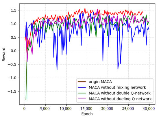 As can be seen in Figure 9, compared with the original MACA algorithm, if the mixing network is removed, the training curve will fluctuate greatly, which results in difficulties for achieving convergence, and it is difficult to obtain the optimal effect. Removing the double Q-network or dueling Q-network will lead to slower training and worse final results. The results of the ablation experiments show that our proposed value decomposition method based on credit assignment can avoid the problem of the dimensional curse and allow the agent to more effectively learn the cooperative strategy. At the same time, the addition of the double Q-network and dueling Q-network to the architecture can effectively alleviate the overestimation of the Q network and help the agent reduce the interference caused by the dynamic environment, effectively promoting the learning process of the agent.