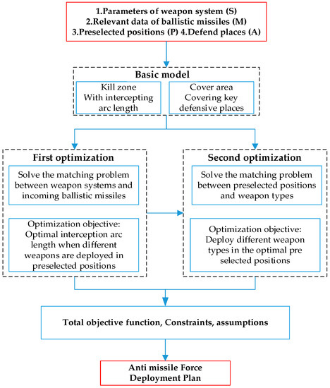 The process of anti-missile troop deployment is mainly to judge the current conditions, predict the trajectory and other related information based on the enemy’s situation, and deploy an appropriate weapon system at the right location so that it can effectively deal with the high uncertainty of a battlefield environment and maximize its operational effectiveness [1,2]. Anti-missile troop deployment is crucial for system-level joint anti-missile operations [3,4], the core part of pre-war mission planning [5], and an important prerequisite for the successful interception of ballistic missiles. This is conducive to grasping the initiative of a war and influencing or even deciding the victory or defeat of the war. Therefore, the research on anti-missile troop deployment has important practical value and military significance.