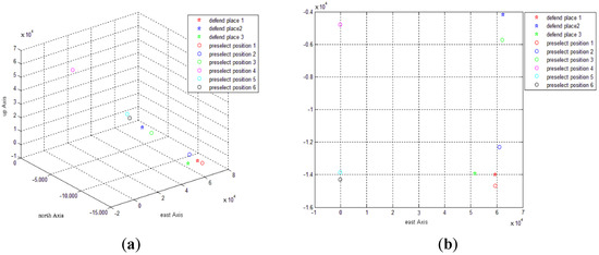 Locations of defend places and preselected positions. (a) 3D (three-dimensional) deployment point, (b) 2D plane deployment point.
