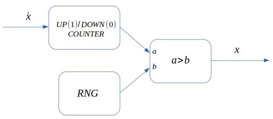 Notice that the design of the integrator includes deciding on the number of bits it has, this being equivalent to set the precision of the integrator, with a noise figure provided by Equation (1). In relation with the number of RNG that are used for this scheme, ref. [28] shows that the use of the same RNG in both inputs leads to an actual improvement of the accuracy.