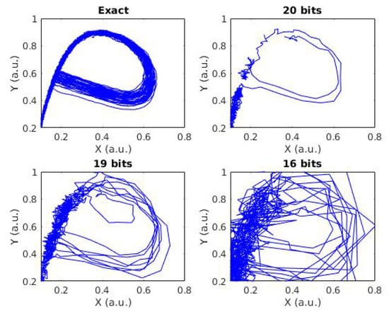 Space state of the x and y variables in the HR model, using conventional arithmetic (top, “exact”), and stochastic computing (20, 19, 16 bits).