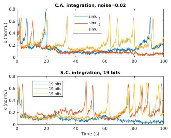 Comparison between three different simulation using the exact (Conventional Arithmetics, C.A.) solution (top) with noise, and three different simulations using SC and 19 bits (bottom).