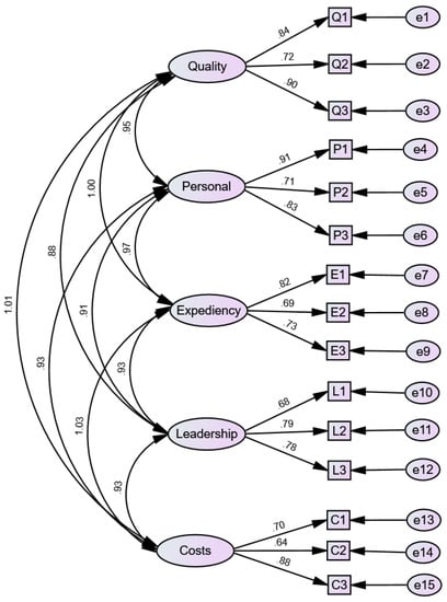 When applying the confirmatory factor analysis (CFA), it became evident that all factor loadings were more than 0.6. A challenge in this study was a rather high correlation between quality and perceived costs, and between expediency and perceived costs (Figure 1). Average variances extracted were larger than 0.6, while congeneric (composite) reliability, which, unlike Cronbach’s alpha, does not assume that all indicator loadings are equal and is less prone to underestimation, was above 0.8. These were sufficiently large values [].