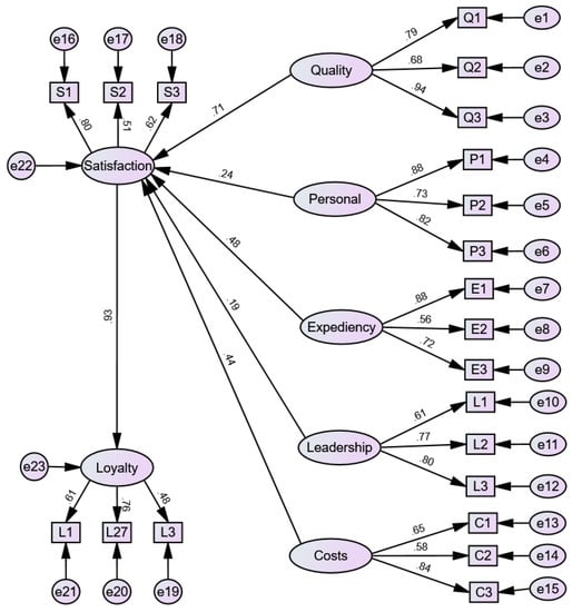 The Goodness of Fit Index in the model outlined in Figure 2 was 0.581. The highest path coefficient among any of the initial five factors and satisfaction, was between quality and satisfaction. It amounted to 0.712, which means that a unit increase in this factor increased satisfaction by 0.71 units. This result supports the findings of Makanyeza and Chikazhe, who claimed a strong link between quality and satisfaction []. On the opposite end is leadership, since a unit increase in the same augmented satisfaction by 0.19 units. Ponnam and Paul [] reported that leadership belongs to the group of factors that exhibit variation in importance over time. Unsurprisingly, a unit increase in expediency increased satisfaction by 0.48, which partially corresponds with the finding that the low latency matters. It is evident that satisfaction and loyalty had a rather large path value of 0.928, which is similar to the findings of Yilmaz et al. []. However, this result could be conditionally accepted at p-value < 10% (Table 3).