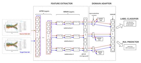Although the aforementioned methods have achieved relatively accurate RUL results, a key problem remains. In most of the equipment RUL predictions, the test and training sets are usually assumed to be from the same working condition and obey the same distribution, so the model has accurate prediction results only under the same working condition. However, in the process of actual product use, most of the products have variable working conditions, and the distribution of sensor monitoring data shows a certain difference, which leads to a sharp decline in the accuracy of RUL prediction. To solve these problems, we need to use models that can adapt to different input characteristics, data distributions, and failure modes. Based on the TCN-RSA framework, Cao et al. [] used the residual self-attention mechanism to shape the internal features, and realized the accurate RUL prediction of the bearing under different working conditions. Unsupervised domain adaptation (UDA) can generalize the knowledge learned from the source domain to the target domain, learn cross-domain invariant features, and effectively reduce the distribution difference between the source and target domains []. UDA mainly achieves distribution alignment through methods such as distance measurement [], feature reconstruction [], and adversarial learning [], reducing the direct distribution difference between the target domain data and source domain data so that the models can be migrated seamlessly. At present, domain adaptation has had several applications in PHM. Lu et al. [] used MMD for the first time to realize domain adaptation in fault diagnosis. Li et al. [] proposed multi-layer domain adaptation (MLDA), using MK-MMD and pseudo-labels. Learning to achieve cross-domain fault diagnosis, Han et al. [] used the adversarial learning method to reduce the distribution difference between the source and target domains to achieve cross-domain fault diagnosis. All of the aforementioned domain adaptive learning methods are intended to solve the problem of fault classification, while for regression problems such as RUL prediction, the method of transfer learning is also widely used. Zhang et al. [] used CNN as a feature extractor and MMD as a domain adaptation loss function to achieve great results in RUL prediction under different operating conditions. Cao et al. [] applied BiLSTM network to transfer learning, proposed TBiLSTM network structure, and used MMD as the domain adaptation loss function to solve the problem of bearing distribution difference under different working conditions. Da Costa et al. [] combined LSTM with adversarial training DaNN to align the characteristics of the source domain and the target domain by maximizing the domain discrimination loss function. Fu et al. [] combined the above two methods and simultaneously used MMD and DaNN to align the characteristics of the source domain and the target domain, and achieved remarkable results. Although these methods effectively improve the accuracy of RUL prediction under different working conditions, due to the distribution of the source domain and target domain being complex, the feature extracted by a single structure can only contain part of the information. Therefore, in order to make full use of the information on the source and target domains and extract more comprehensive cross-domain invariant features, this paper proposes an RUL prediction model based on LSTM and multi-representation domain adaptation (MRAN) to represent the original data more comprehensively and improve the domain adaptability. The temporal and spatial features of the source domain and target domain are fully extracted by LSTM and multiple convolution substructures, and the distribution differences between domains are reduced from different feature spaces by minimizing CMMD. The extracted features after the final training are used as the degradation features of the target domain for life prediction. The structure can extract cross-domain invariant features from different spaces, effectively improving the prediction accuracy of RUL under different working conditions. The performance of the model is verified by using turbine engine data sets under different operating conditions and fault modes.