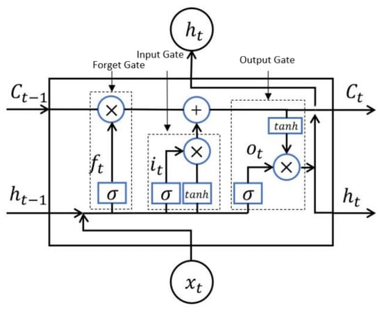In the process of predicting the RUL of products based on degradation data, historical data have an important effect on the performance and state of products at the current time. The long short-term memory network (LSTM) is improved by RNN, it solves the problem that RNN cannot deal with remote dependence. The LSTM unit consists of three gate structures: forget gate, input gate, and output gate. The structure of the LSTM unit is shown in Figure 3, the cell state update includes the following steps: the forget gate is responsible for determining which information will be discarded from the cell state, then the input gate determines which information currently input will be retained in the cell state, and finally the output gate determines which information the cell will output. In this way, the problems of gradient disappearance or explosion are effectively overcome.