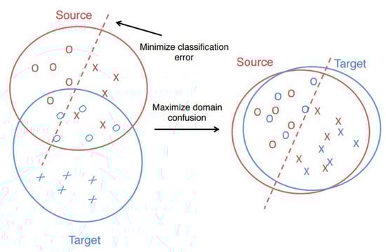 In unsupervised domain adaptation learning, a source domain and a target domain are defined, where the source domain has labeled data and the target domain has unlabeled data. The label values of and are in the same range, and the data distribution of the two domains is not equal, that is, . The purpose of domain adaptation learning is to use the model to learn knowledge from the source domain and improve the prediction ability of the target domain. As shown in Figure 5, the main idea is to find the cross-domain invariant characteristics in line with the common distribution, and shorten the distance between the source and target domains. Domain adaptive neural network (DaNN) [] uses maximum mean discreteness (MMD) to extract domain invariant features. Tzeng et al. [] proposed DDC neural network to further shorten the distance between the two domains by combining neural network and MMD. Long et al. [] used MK-MMD to replace the original single-core MMD and proposed DAN using multiple cores to construct the total core. These studies are from the perspective of reducing the distribution differences between domains, and transfer by designing better distribution measurement differences.
