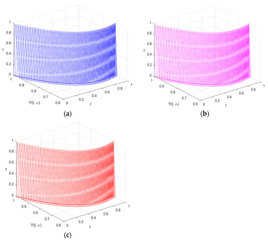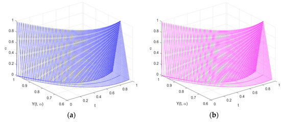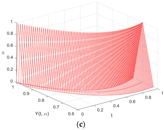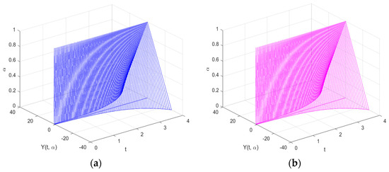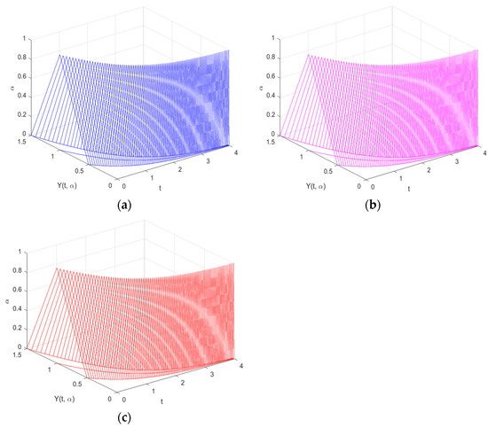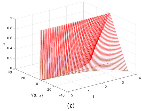 Graphs are used to depict the study’s findings and demonstrate how the solutions to both FDEs behaved in the time domain . It is discovered that both solutions are expanding as increases under the (i)-differentiability. However, this is not the case under the (ii)-differentiability, which is contracting. This is consistent under the (i) and (ii)–differentiability interpretations.