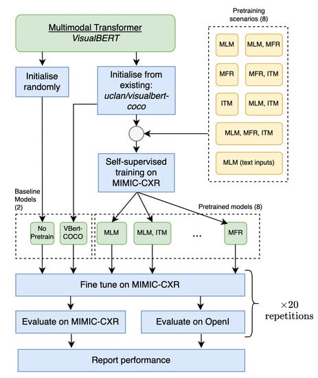 - Li, Y.; Wang, H.; Luo, Y. A Comparison of Pre-trained Vision-and-Language Models for Multimodal Representation Learning across Medical Images and Reports. In Proceedings of the IEEE International Conference on Bioinformatics and Biomedicine (BIBM), virtual event, 16–19 December 2020; pp. 1999–2004. [Google Scholar] [CrossRef]