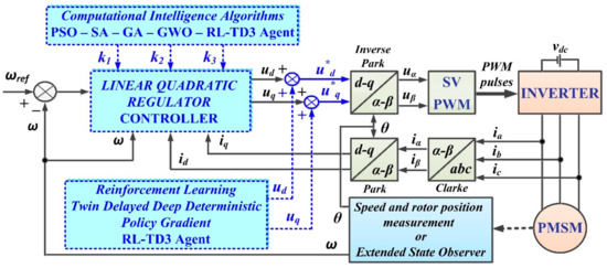 In addition, an optimization of the performance of PMSM–CS–CI will be performed by using an RL-TD3 agent for the CCSs. It can be specified that, in the case of the LQR-type controller, the command can be written as a linear weighted sum of the state variables; due to the structure of the neural network used (as will be presented in Section 6 and Section 7), an RL-TD3 agent will be used to optimize the LQR-type controller’s parameters.